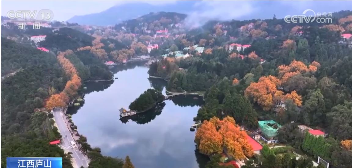 11月的庐山,秋色渐浓,风景如画。高空俯瞰,如琴湖畔,梧桐叶黄、鸡爪槭红。山雾随风而起,半遮半掩,色彩斑斓的秋天景色若隐若现,倒映在湖中如梦如幻。众多游客纷至沓来,登山赏景,打卡留念。