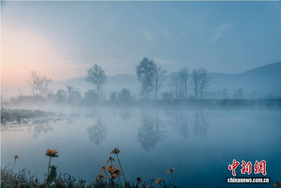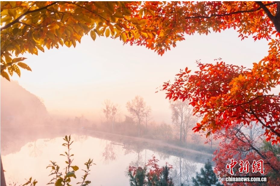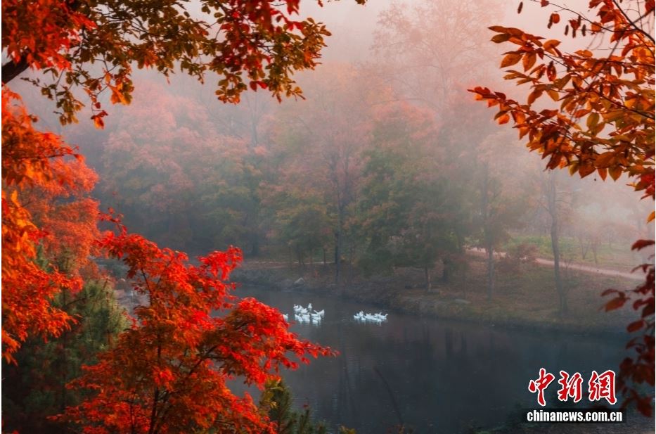 10月12日,吉林省舒兰市“枫水人家”休闲家庭农场秋景,红枫似火,湖面薄雾笼罩。