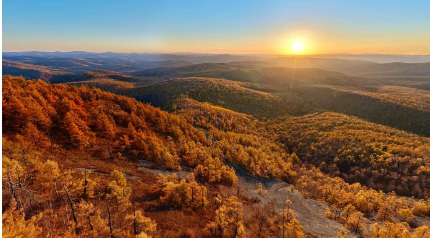 这是2025年9月28日在内蒙古牙克石市绰河源镇拍摄的大兴安岭林海日出(无人机拼接照片)。新华社记者 马金瑞摄