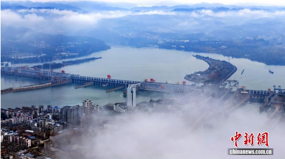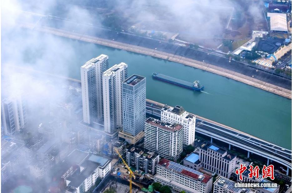 连日来,湖北宜昌暂别湿冷,迎来晴好天气。清晨云雾笼罩长江正川门至葛洲坝水域,航道内的出川船舶穿云破雾缓缓航行,与两岸错落的建筑共同构成流动的画卷。图为云雾笼罩葛洲坝航道。(无人机照片)